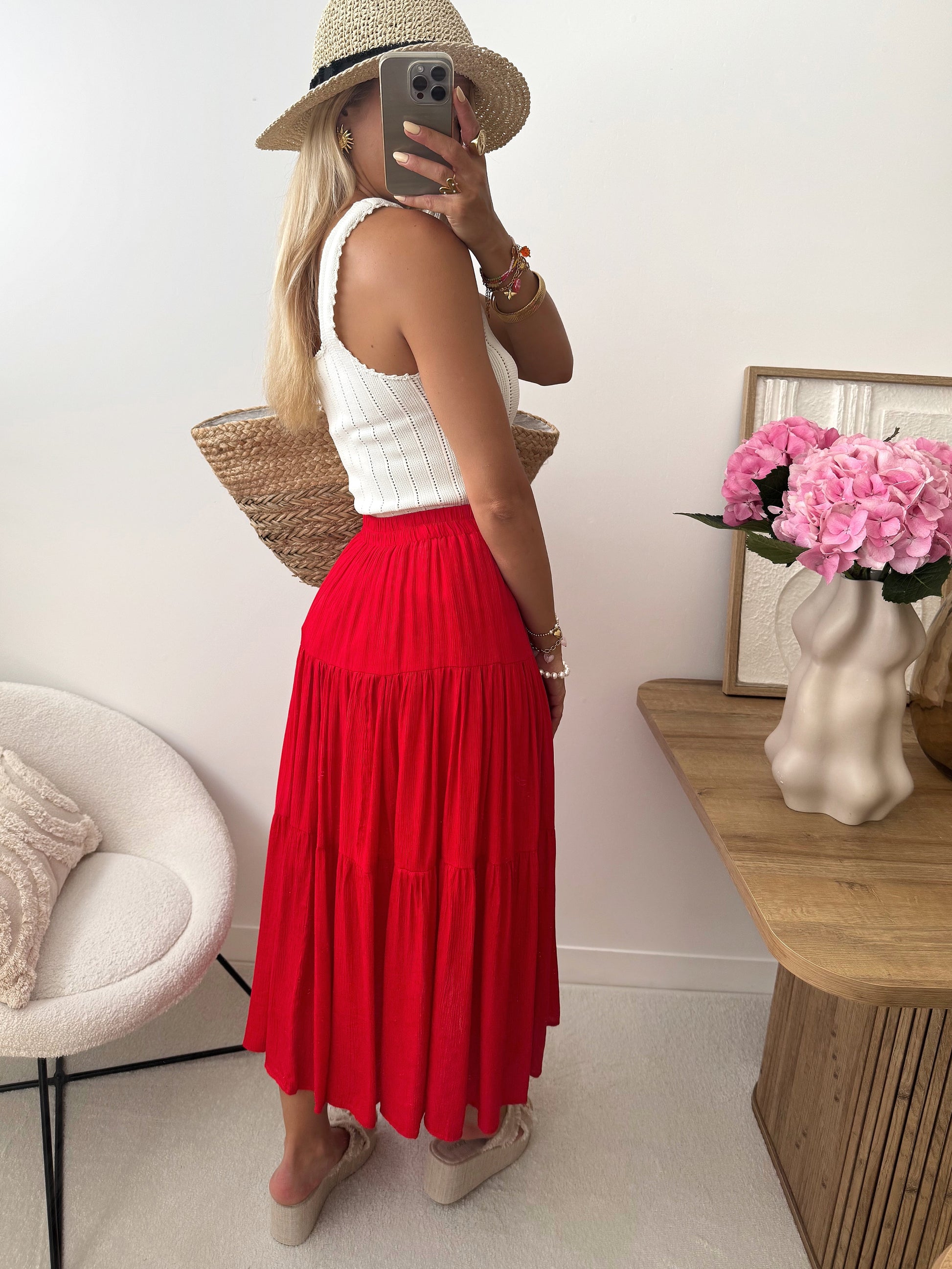 The AVETIS square-neck top features a charming openwork knit and ribbed finish, creating a feminine yet textured silhouette. The thin straps complete its lightweight look, making it ideal for sunny days.