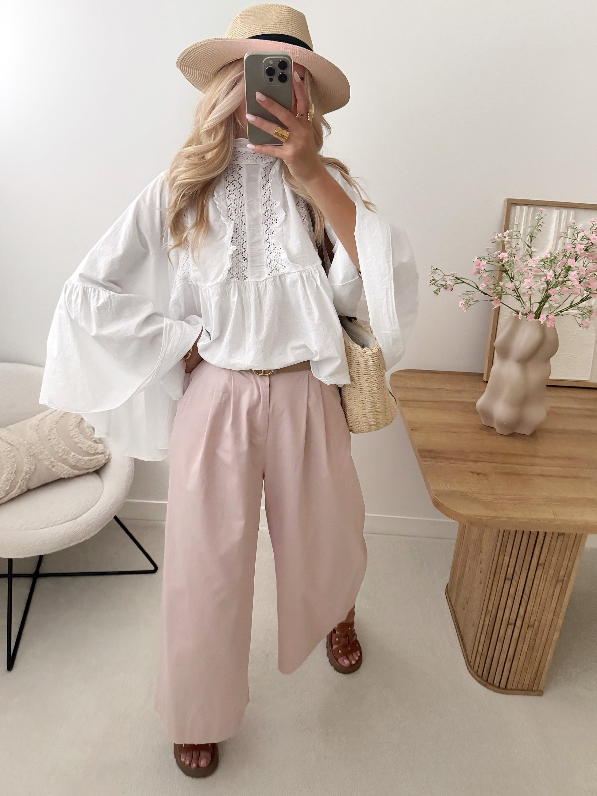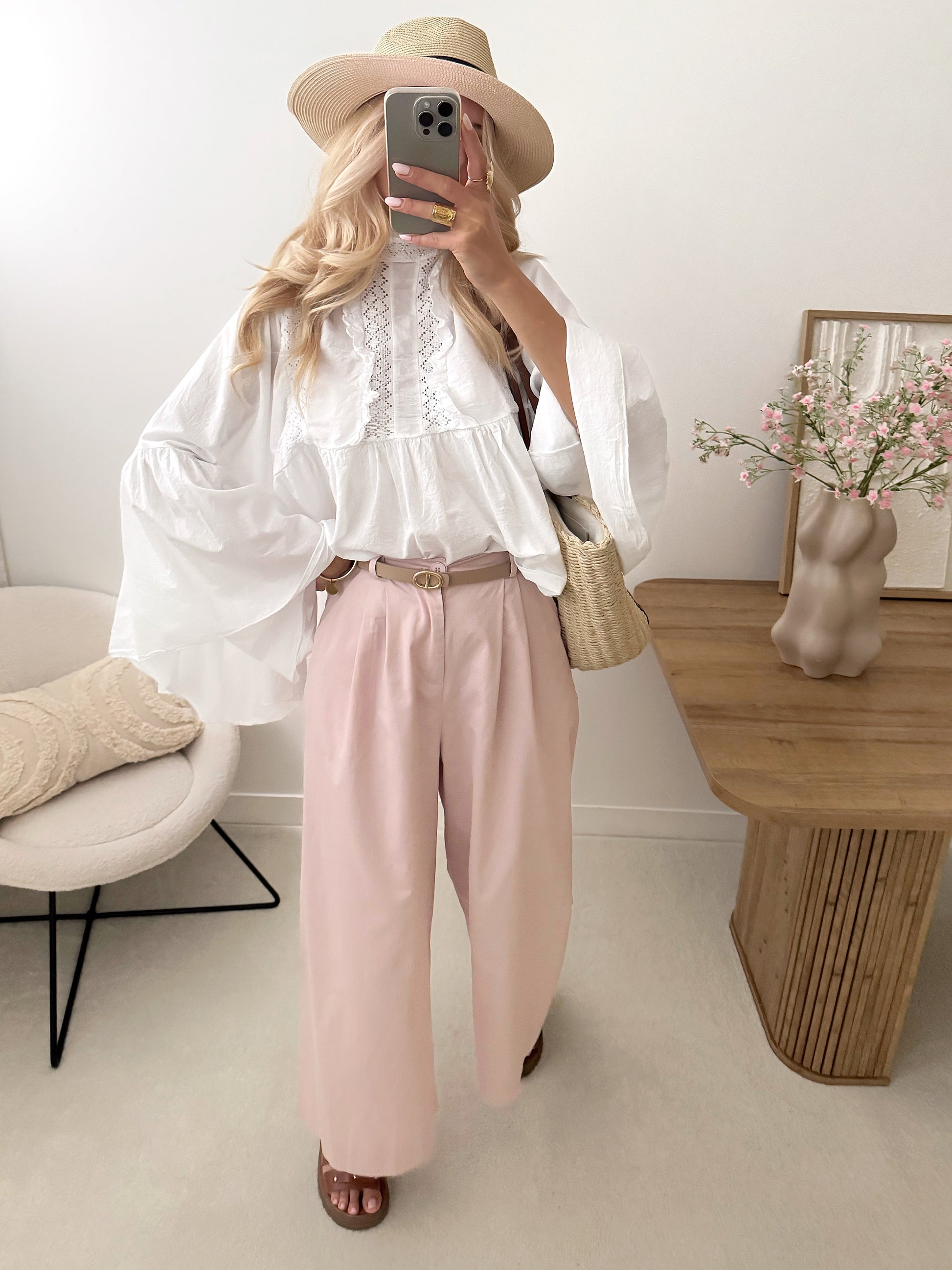 Combine structure and fluidity with these straight-cut, culotte-effect pants, designed to combine comfort and elegance for everyday wear. Featuring pleats on the front, they flatter the figure without restricting it, and offer a beautiful fit. The waistband is equipped with belt loops to slip in a belt as desired, while the elasticated back ensures a comfortable fit and optimal ease of movement. Practical without compromising style, these pants have Italian pockets on the sides, and two patch pockets on the back, for a casual chic touch. This style adapts to all desires: wear it with a tucked-in blouse for a soft office look, or with a fitted top and sandals for a more relaxed and contemporary look. It also lends itself to layering with a flowing blazer or a lightweight knit in between seasons. A must-have for the modern wardrobe, perfect for those who like to combine feminine allure, comfort, and a tailoring spirit effortlessly.