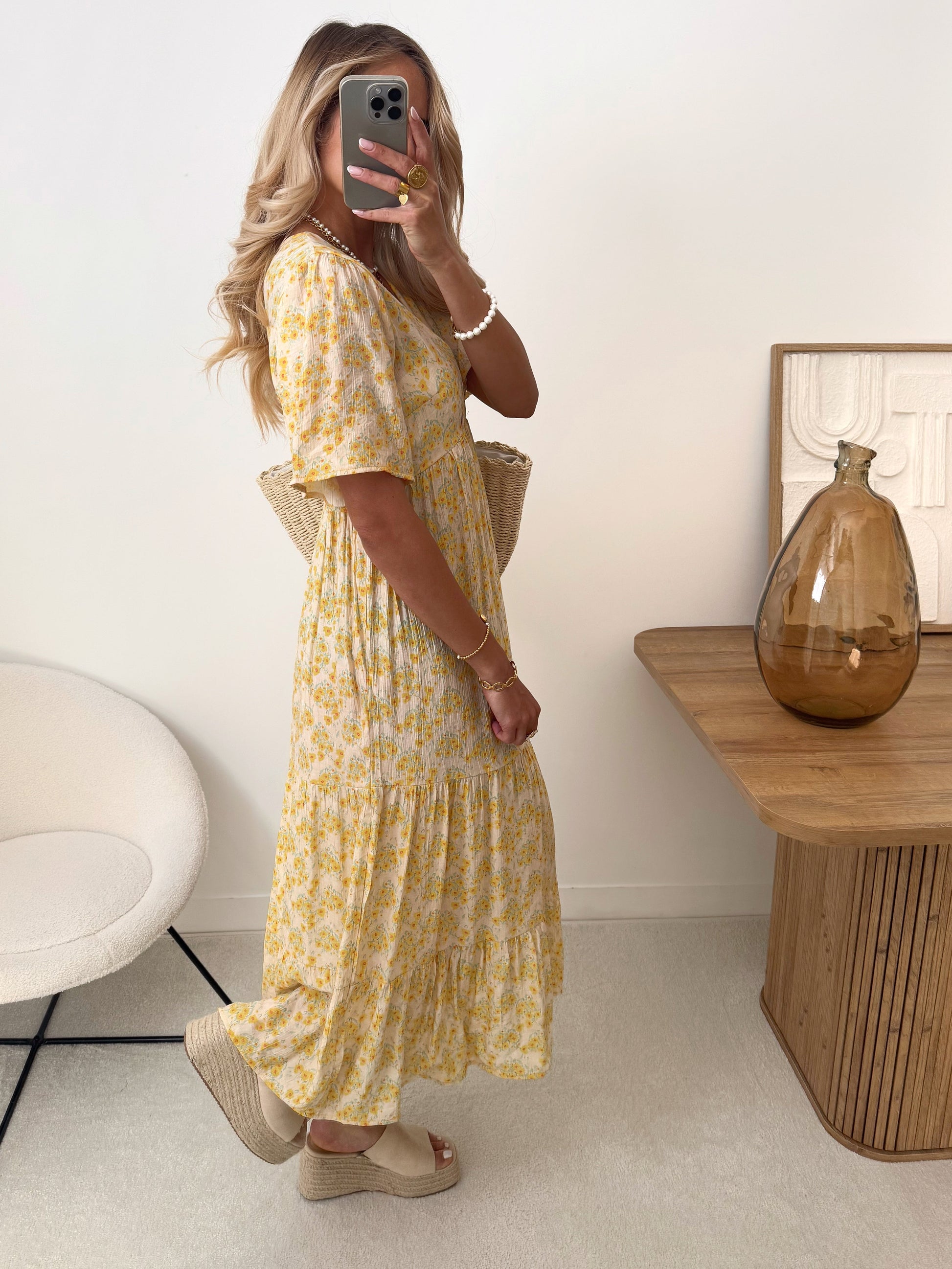 The floral print maxi dress you need this summer. With its crossover V-neckline, slightly flared cut, and elasticated waistband at the back, this dress combines comfort and femininity. Its floral print adds a fresh and romantic touch, perfect for sunny days. The short sleeves add a touch of freshness, and the ruffled hem adds movement with every step. Easy to wear, it's self-sufficient: sandals, a basket, and you're ready for the day. A must-have piece to pack in your suitcase or adopt now.